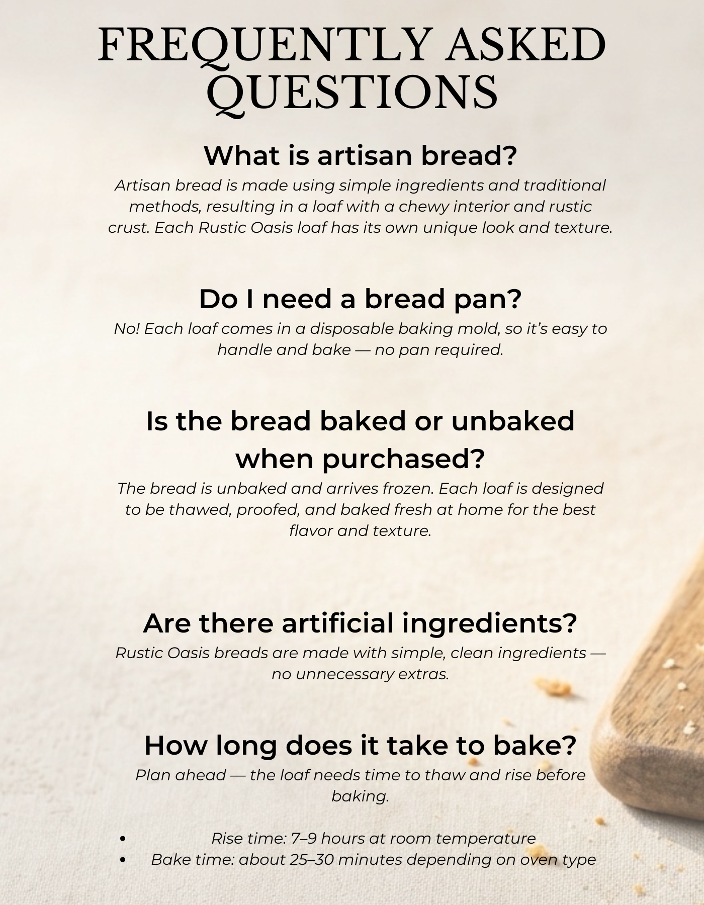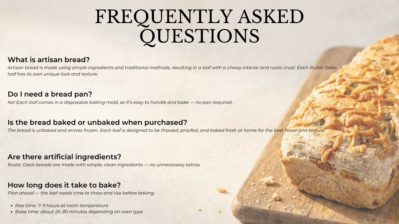 Have a question about Rustic Oasis Artisan Bread, flavors, or how it works? We’d love to hear from you. Fill out the form below and someone from our team will be in touch soon.